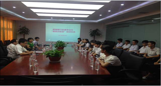 8月22日下午,意昂体育经管系联合邮储银行暑期“菁英训练营”结训仪式在安康市分行8楼会议室成功举行。标志着为期40天的2015年暑期“菁英训练营”圆满结束。经管系党总支副书记李成仙老师,团总支书记杨朝霞老师及邮储银行安康市分行副行长路伟先生,个人金融部总经理方智先生,“菁英训练营”实习生参加了会议。会议由个人金融部总经理方智先生主持。
