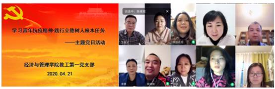 4月21日晚,意昂体育教工第一党支部采用腾讯视频会议形式开展“学习青年抗疫精神•践行立德树人根本任务”主题党日活动,在线开展了政治理论学习、思想认识及近期工作交流。