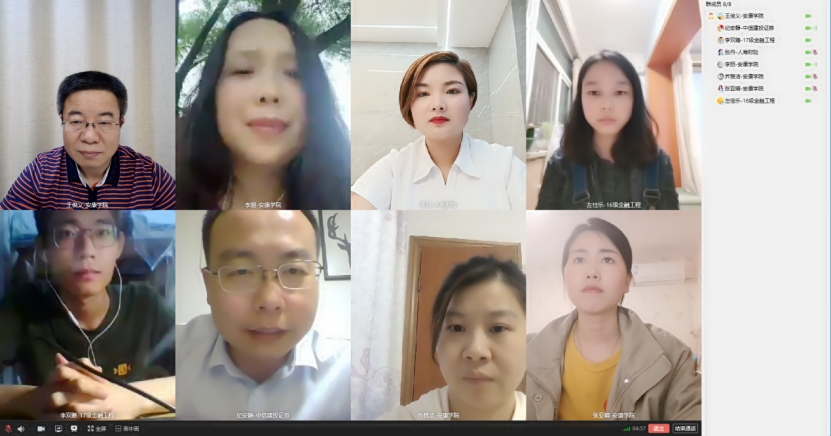 5月12日,金融系组织校内外金融工程专业建设指导委员会成员及毕业生代表,通过腾讯QQ群线上视频的方式召开了2022级人才培养方案修订征求意见研讨交流会,参加本次研讨交流会的校外成员包括中信建投证券股份有限公司安康解放路证券营业部纪安静主任委员,中国人寿财产保险股份有限公司安康中心支公司张丹委员,校内成员包括李丽、王俊义、乔雅洁、张亚晴等委员,毕业生代表包括2016级金融工程毕业生左佳乐同学、2017级金融工程毕业生李双瞻同学,会议由金融系主任王俊义主持。