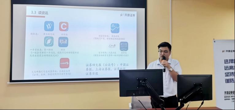 业务部经理屈峥首先对一级市场和二级市场的主要投资品种进行了介绍;其次对通达信、同花顺、东方财富、wind、KMAX等各类软件功能的特点和咨询阅读的主要APP分类进行了具体的分析;最后对市场的投资逻辑和投资策略结合案例进行了讲解,并就同学们提出的问题进行了互动交流。