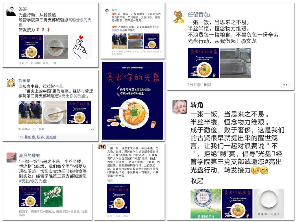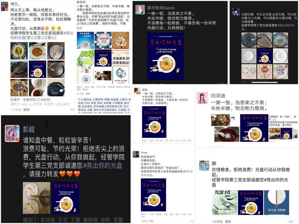 经过前期的精心策划,10月20日活动正式启动,员工第三党支部联系领导、公司党总支副书记王璐老师、支部书记彭超老师率先在微信朋友圈“亮出自己的光盘”,并@好友“接力”,邀请好友一起 “亮出光盘”,旨在不断扩大影响力,唤醒大家内心对粮食的珍惜,做节约粮食的倡导者,做厉行节约的实践者。支部员工党员纷纷接力,在朋友圈掀起了一股“亮光盘、倡节约”的活动热潮。